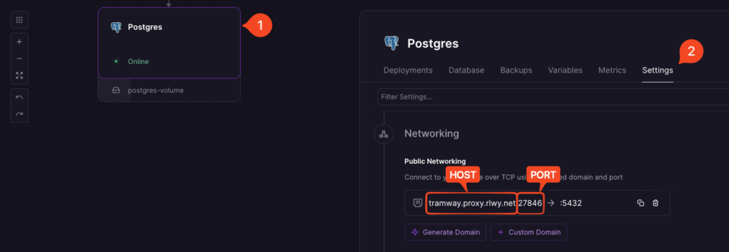 - ไปที่แท็บ Settings > Networking เพื่อดู Host และ Port