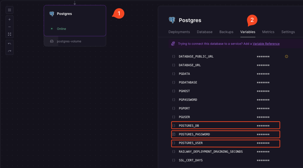 - ไปที่แท็บ Variables เพื่อดู Username, Password, Database Name