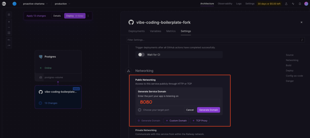 - ใส่ port 8080 (หรือ port ที่ app ใช้) แล้วคลิก Generate Domain (ไม่จำเป็น)