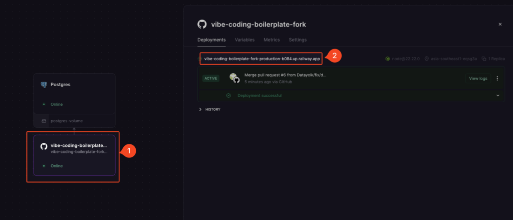 เมื่อทุกอย่างพร้อม project จะแสดงสถานะ Online ทั้ง Postgres และ App: