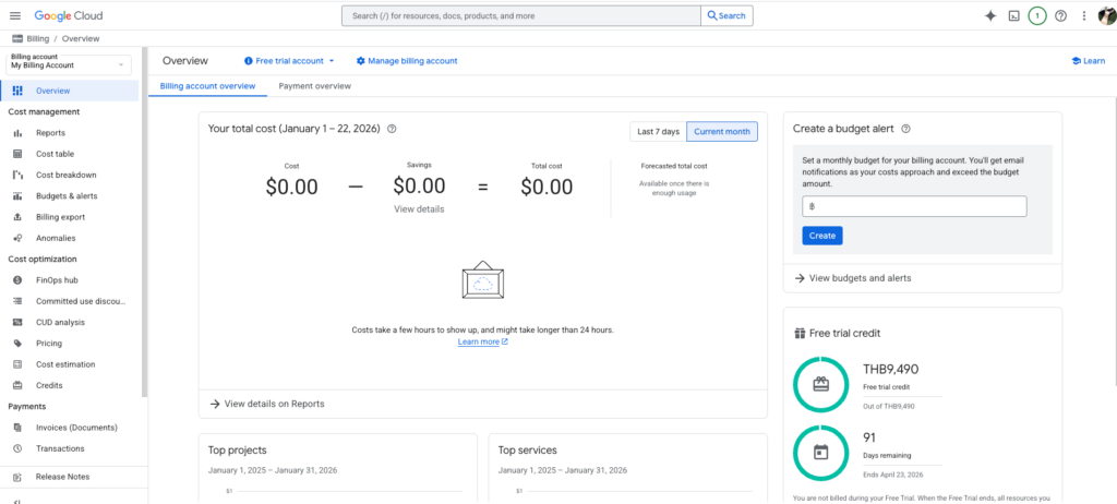 - หลังจากสร้างเสร็จ จะเห็นหน้า Billing Overview พร้อม Free trial credit ถ้าหากยังไม่เคยใช้บริการ Google Cloud มาก่อน