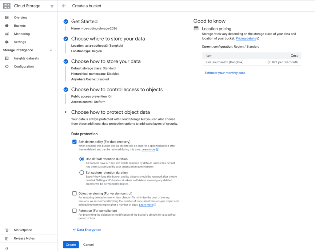 - Location — เลือก asia-southeast3 (Bangkok) สำหรับผู้ใช้ในไทย