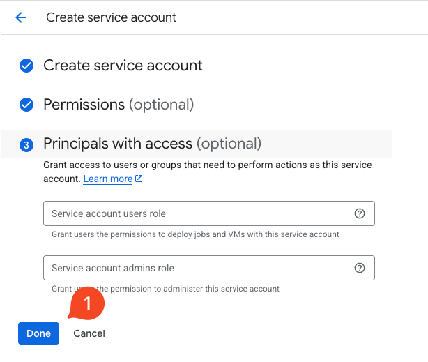 คลิก Done (1) เพื่อสร้าง service account