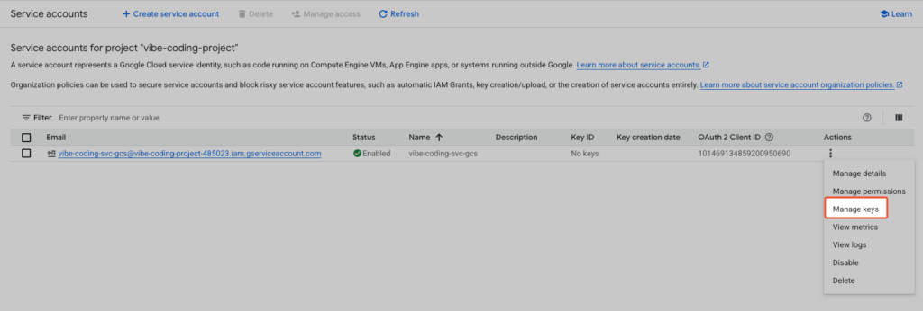 - ในรายการ service accounts คลิก ⋮ แล้วเลือก Manage keys